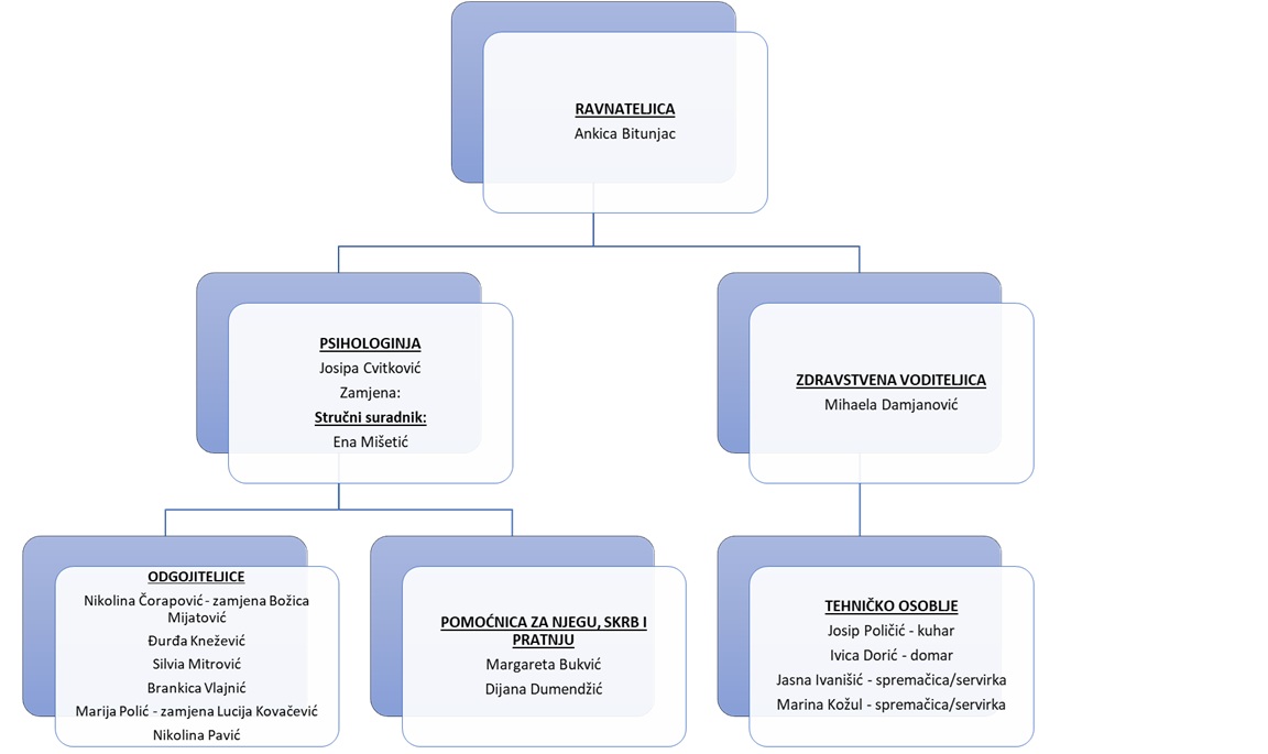 Dječji vrtić ima tri odgojno-obrazovne skupine u redovitom 10-satnom programu i skupinu predškolskog programa u popodnevnom terminu te 13 stalno zaposlenih djelatnika.