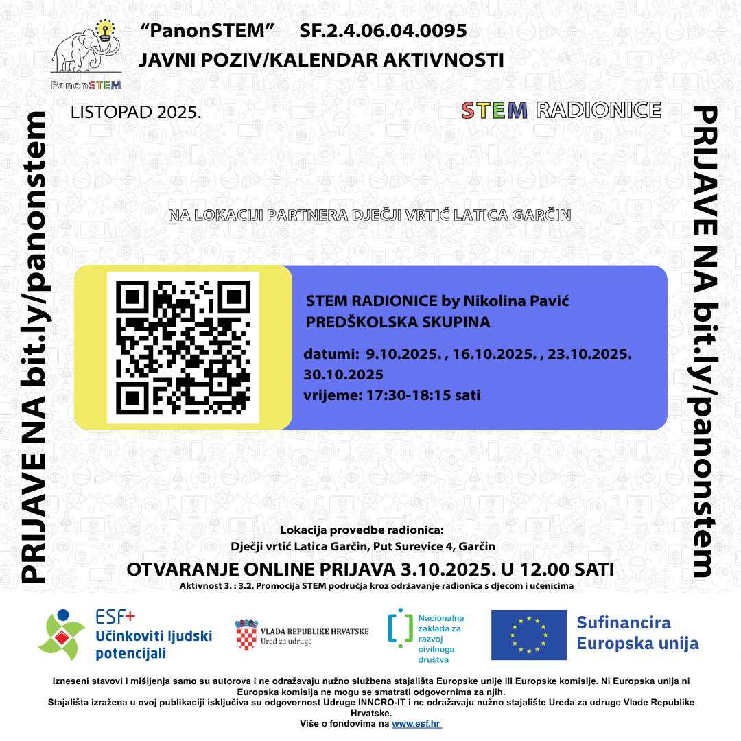 Kao jedna od partnerskih ustanova na projektu “PanonSTEM” , s ponosom objavljujemo javni poziv sa kalendarom aktivnosti i pozivamo sve zainteresirane polaznike, roditelje, članove zajednice – da se uključe u nadolazeće besplatne STEM radionice i aktivnosti.
