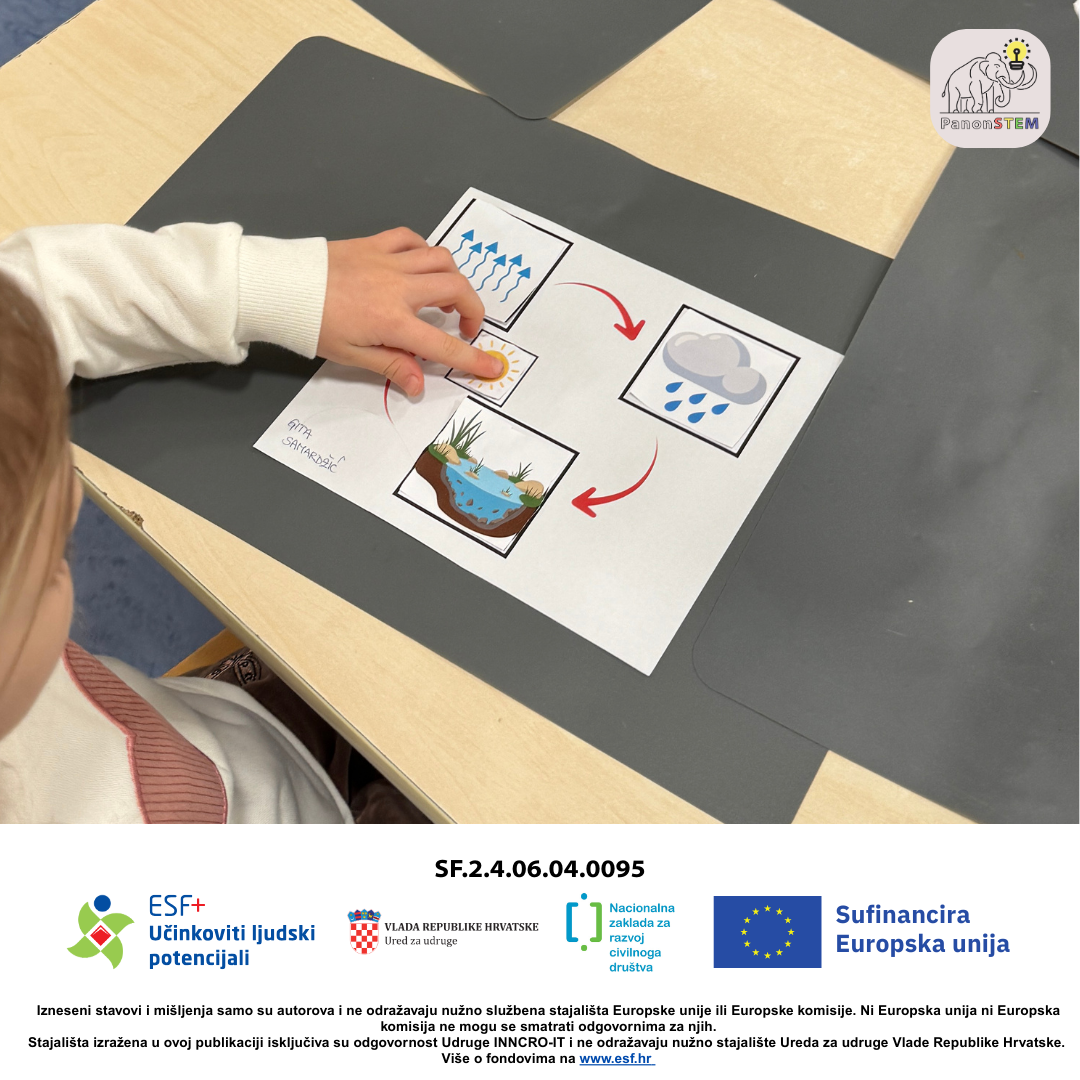 Treći dan STEM kampa bio je posvećen istraživanju prirodnih pojava i učenju kroz praktičan rad. Djeca su učila o kruženju vode u prirodi, rješavala slagalicu te povezivala pojmove poput isparavanja, kondenzacije i padalina.