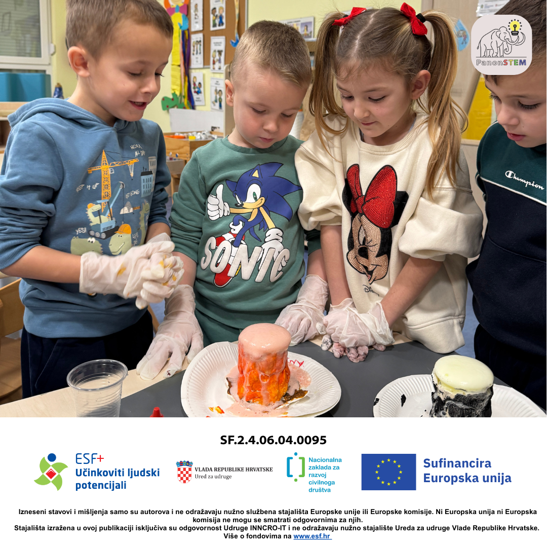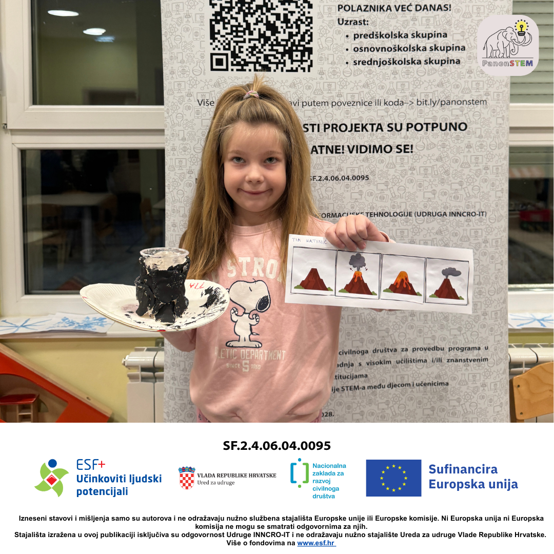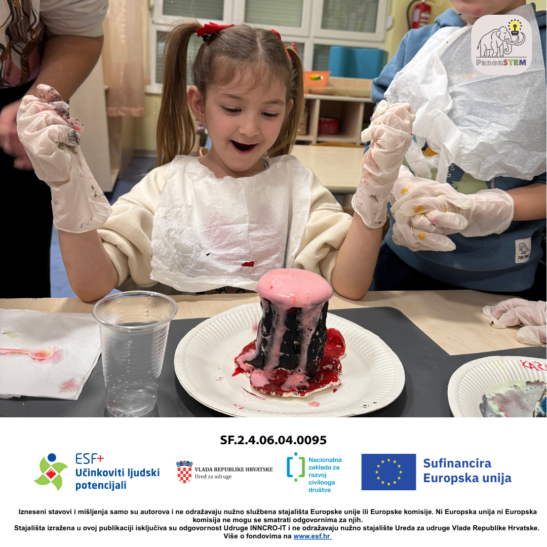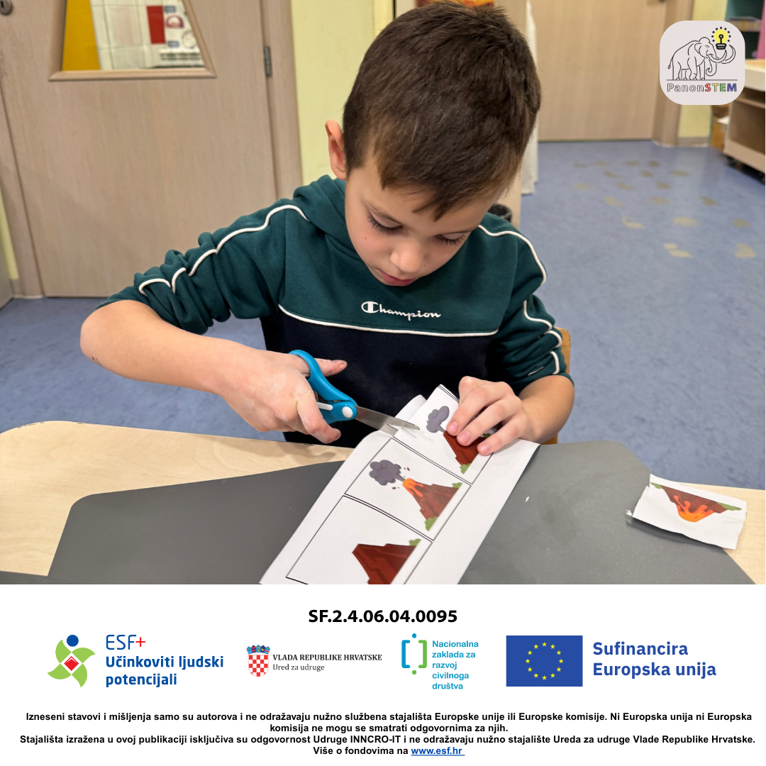 Nakon toga uslijedio je najuzbudljiviji dio – pokus erupcije vulkana ! Djeca su promatrala kako dolazi do erupcije te su slagala slagalicu s redoslijedom erupcije vulkana, rezala elemente škarama i lijepila ih u pravilnom slijedu, povezujući praktični pokus s naučenim sadržajima.